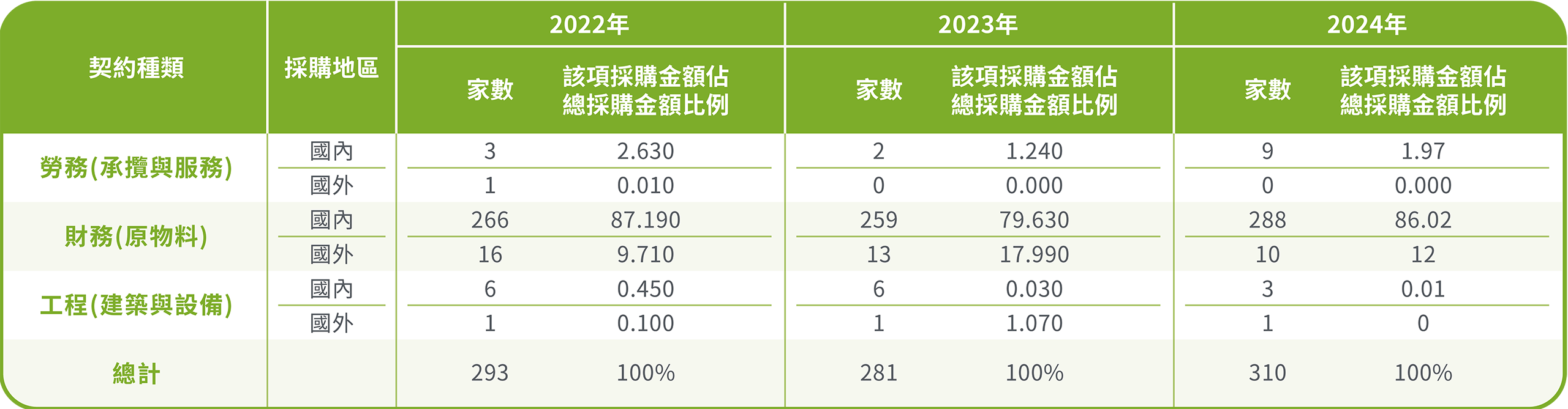 落實與供應商建立長期合作關係,透過供應商評鑑,考量「價格」、「品質」、「交期」等因素,選擇最合適之國內供應商。公司也遵循ISO 14001環境管理系統,製訂管理承包商施作及供應商產品的方法:透過縝密的採購供應鏈管理流程,在前端詳實揭露承攬的權利義務等資訊、限定評鑑合格的廠商承攬專案工程;施作期間不定期視察廠商的產品及施作過程。謹慎對待發包工程的每一處細節,與供應商及承包商簽約之前,充分說明工作內容、規範、時程、安全等事項,讓廠商完全瞭解施作範圍及風險所在。