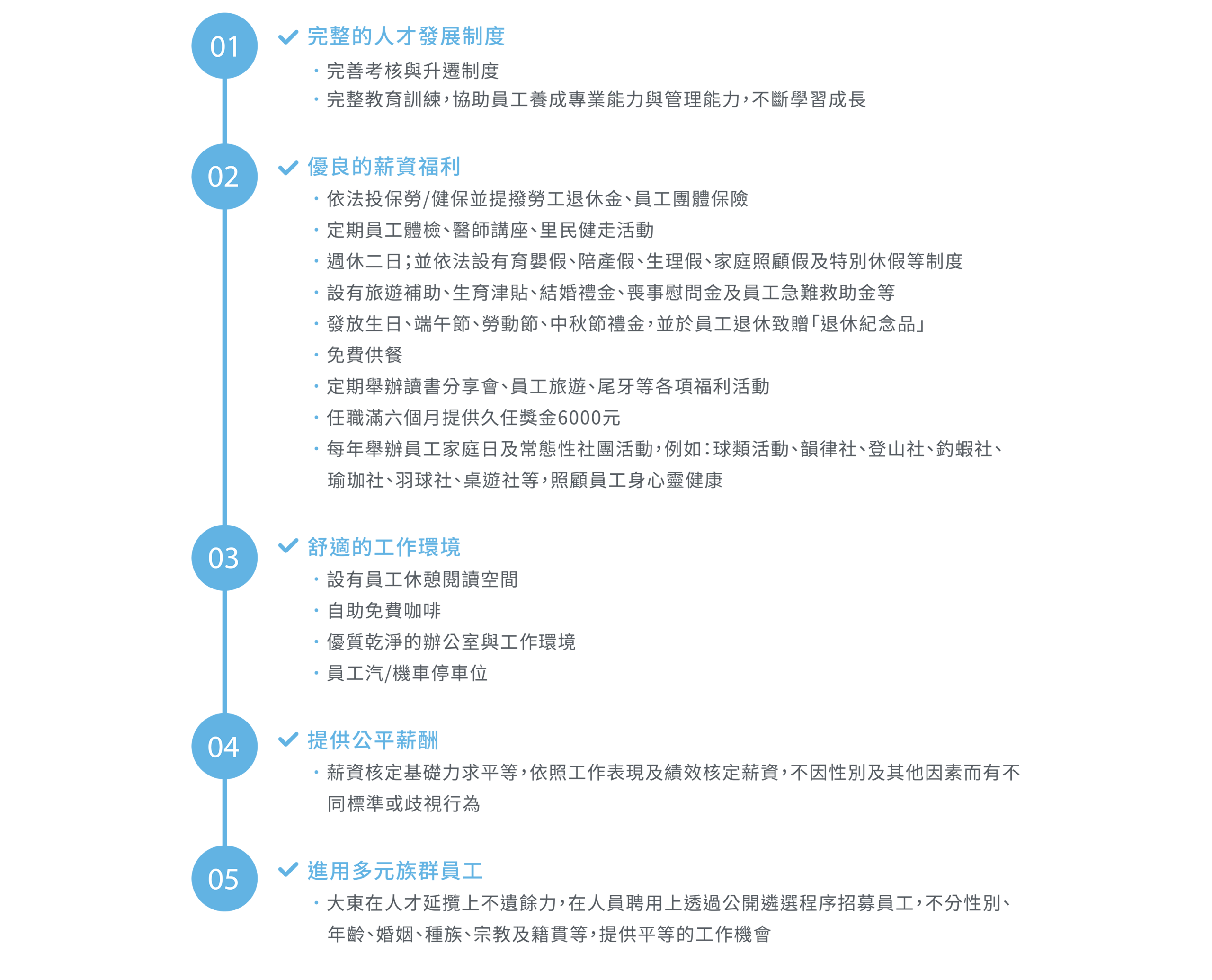 大東在人員聘用上透過公開遴選程序招募員工,不分性別、年齡、婚姻、種族、宗教及籍貫等,均提供平等的工作機會,此外,亦積極落實職場平權,不分男女,充份提供員工性別公平競爭及發展之機會,促進男女平權與支持職場多元化。為維護弱勢族群的工作者權益,大東亦積極進用原住民及身心障礙等弱勢團體員工,提供其與一般員工無分別的工作機會及薪資福利。