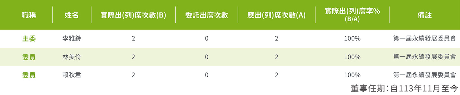 本公司遵循ESG政策的願景與使命,設置永續發展委員會,主任委員為李雅鈴永續長,委員會負責相關政策擬定及相關管理方針訂定,本委員會依據環境面、社會面及公司治理面三大面向規劃執行各面向永續發展事務,每年定期向董事會報告執行情形。